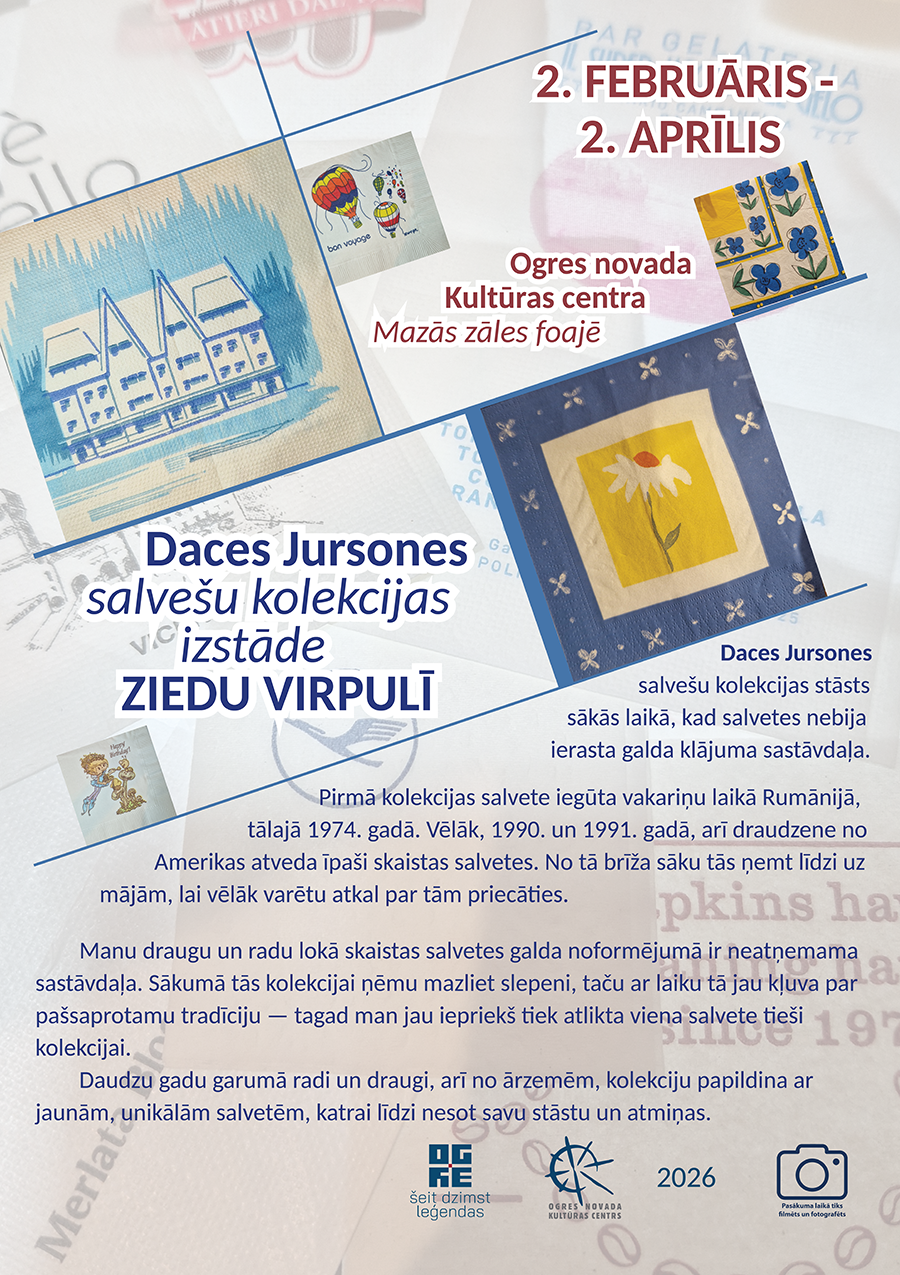 Izstāde bez maksas apskatāma no 2. februāra līdz 2. aprīlim Ogres novada Kultūras centra Mazās zāles foajē