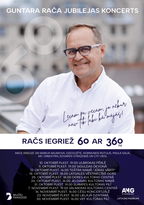 Guntara Rača 60 gadu jubilejas koncertu sērijā skanēs tikai kopīgi ar Maestro Raimondu Paulu radītās dziesmas, no kurām daudzas jau kļuvušas par sava žanra klasiku un mūsdienu tautasdziesmām! Jūs gaida dzirkstošs prieks, lustīgas un laika pārbaudi izturējošas dziesmas, pamatīga līdzi dziedāšana un aizraujošs priekšnesums – īsts Maestro Raimonda Paula melodiju virpulis!