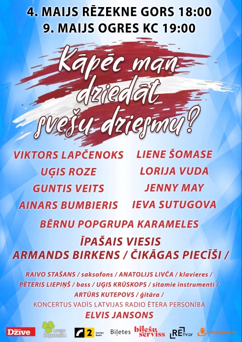 Jau daudzviet Latvijā ar vētrainām ovācijām ir izskanējis vērienīgais koncerts “Kāpēc man dziedāt svešu dziesmu”. Lielā klausītāju atsaucība iedvesmojusi organizatorus un mūziķus turpināt šo tradīciju. Nākamie koncerti notiks jau 4. maijā Latgales vēstniecībā “Gors” Rēzeknē un 9. maijā Ogres kultūras centrā.