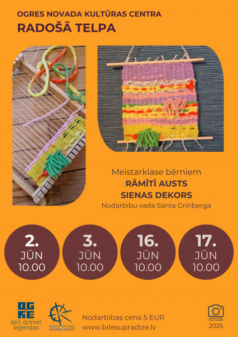 Aicinām bērnus vecumā no 10 gadiem (jaunāki bērni meistarklasi aicināti apmeklēt pieaugušā pavadībā) apmeklēt radošu nodarbību, kuras laikā no dzijām, auduma strēmelītēm un citiem materiāliem izgatavosim austu sienas dekoru.