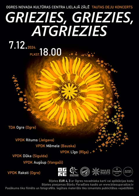 Tieši tādēļ 7. decembra vakarā plkst. 18.00 Ogres novada Kultūras centrā jau astoto reizi iemirdzēsies deju kolektīva "Raksti" koncerts "Griezies, griezies, atgriezies"!
