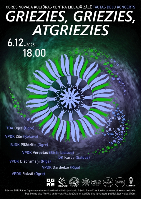 Griezies, griezies, atgriezies – tautas deju koncerts, kas 2025. gada 6. decembrī aicina skatītājus uz sirsnīgu ceļojumu kolektīvu bērnības, krāsainu notikumu nebēdnīgajās atmiņās. Dejas ritmā atdzīvosies sajūtas, kas mūs veidojušas – pirmie soļi, pirmie svētki, pirmie sapņi.