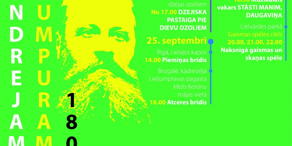 24. un 25. septembrī vairākās Latvijas vietās norisināsies dzejnieka Andreja Pumpura (22.09.1841.– 06.07.1902.) 180. dzimšanas dienai veltīti atceres brīži, dzejas lasījumi, muzikāli pārsteigumi, kā arī audio vizuāls brīvdabas gaismas un skaņas uzvedums, kas radīts pēc eposa “Lāčplēsis” motīviem.