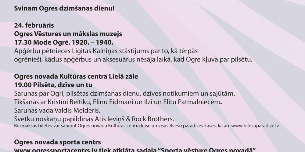 Šogad, februārī aprit 94 gadi kopš Ogre ieguvusi pilsētas statusu, tāpēc visa mēneša garumā, aicinām svinēt Ogres dzimšanas dienu, piedaloties dažādos svētku notikumos.