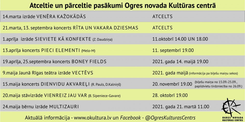 Saglabājoties valstī noteiktajiem epidemioloģiskajiem ierobežojumiem, mainīts vairāku Ogres novada Kultūras centra (ONKC) telpās paredzēto pasākumu norises laiks.