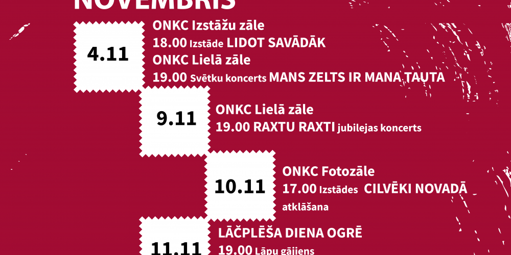 18.novembrī, Latvijas Republikas proklamēšanas 104. gadadienā, Ogres novada Kultūras centrā plkst. 16.00 norisināsies svētku koncerts un apbalvojumu OGRES GODA NOVADNIEKS un OGRES GADA NOVADNIEKS pasniegšana. Koncertā Latvijas Nacionālā teātra aktieri Madara Botmane, Kristians Karēļins, dziedātājs Juris Jope un Ogres novada Kultūras centra jauniešu koris IMPULSS izpildīs Zigmāra Liepiņa, Raimonda Paula, Aināra Virgas, Mārtiņa Brauna un citu komponistu melodijas, kas vienoja un sargāja mūs dažādos likteņu griežos, – dziesmas, kurās kā pūrā ielocīts Tēvzemes vārds, valoda un latvieša dvēsele. Ieeja pasākumā bez maksas. Svētku noslēgumā, plkst. 19.00, Daugavas krastā pie vides dizaina objekta OGRES BĀKA debesis izgaismos Latvijas Republikas proklamēšanas 104. gadadienai veltīta uguņošana.