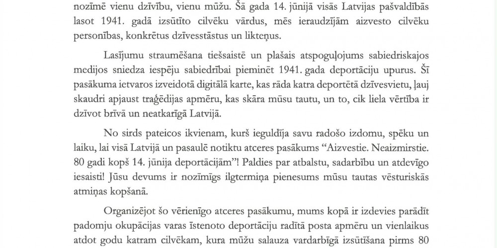 Valsts prezidenta pateicība par atceres pasākuma "Aizvestie. Neaizmirstie. 80 gadi kopš 14. jūnija deportācijām" rīkošanu.