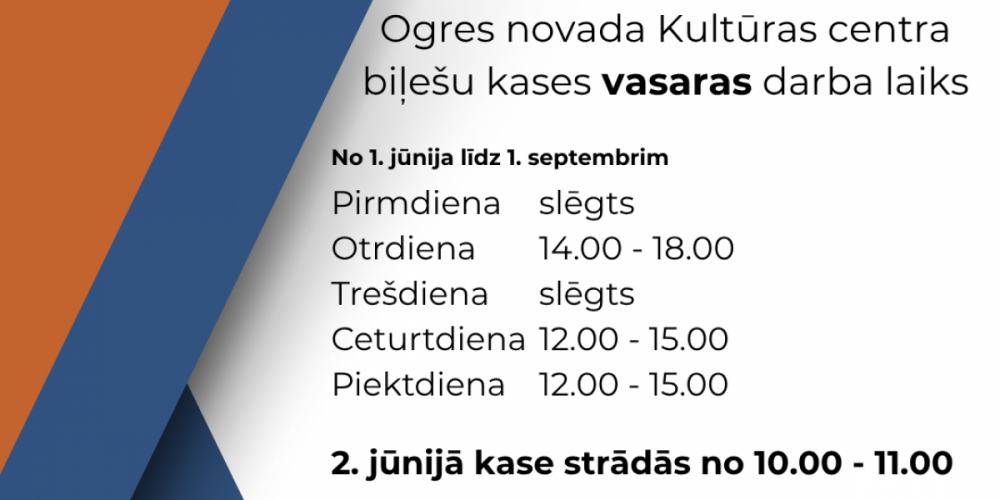 No 1. jūnija līdz 1. septembrim Ogres novada Kultūras centra kase strādās pēc vasaras darba laika.