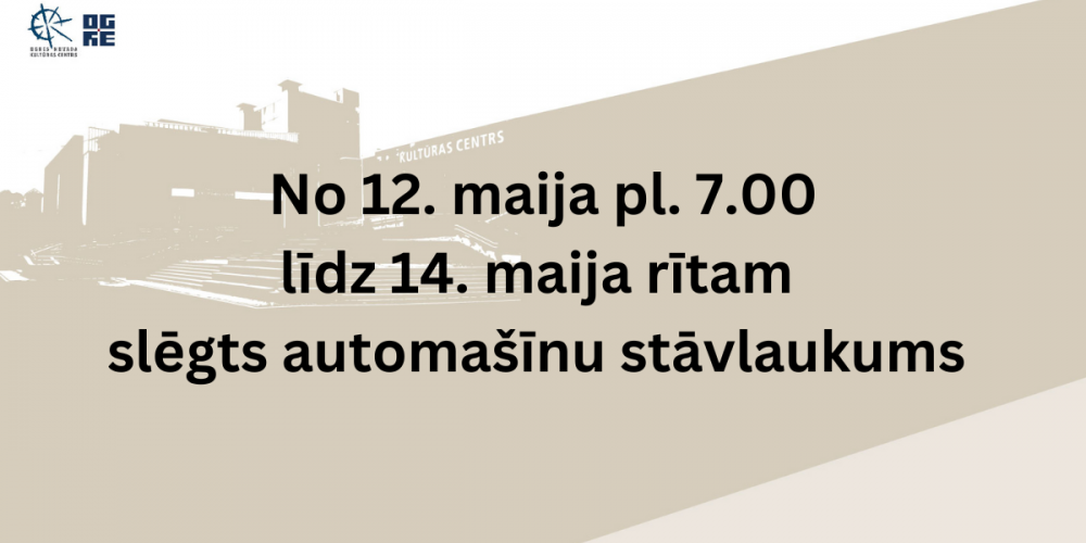 laikā no 12. maija pl. 7.00 līdz 14. maija rītam būs slēgts automašīnu stāvlaukums pie Ogres novada Kultūras centra galvenās ieejas.