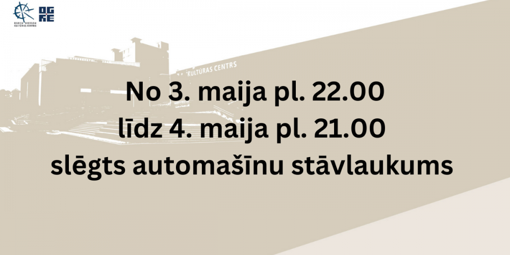 laikā no 3. maija pl. 22.00 līdz 4. maija pl. 21.00 būs slēgts automašīnu stāvlaukums pie Ogres novada Kultūras centra galvenās ieejas.