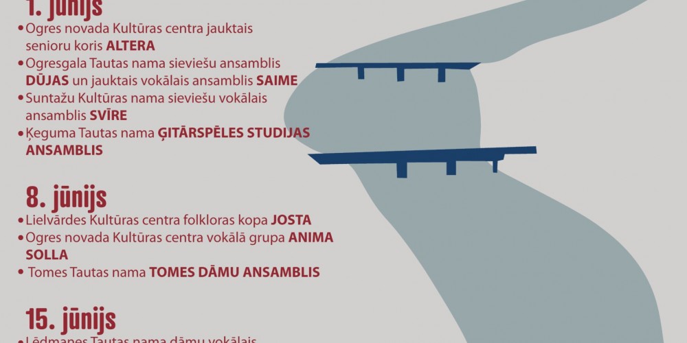 Koncerti Ogres upes promenādē norisināsies jūnija ceturtdienās plkst. 20.00. Jau nākam ceturtdien, 8. jūnijā ar dabas iedvesmotām melodijām un latviešu tautasdziesmām klausītājus priecēs Lielvārdes Kultūras centra folkloras kopa JOSTA, Tomes Tautas nama Tomes dāmu ansamblis un Ogres novada Kultūras centra vokālā grupa ANIMA SOLLA.