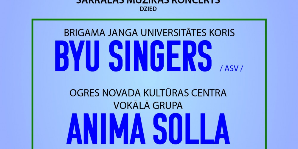7. maijā plkst. 18.00 Ogres novada Kultūras centra Mazajā zālē uz sakrālās mūzikas koncertu aicina Ogres novada Kultūras centra vokālā grupa ANIMA SOLLA un Brigama Janga universitātes koris BYU SINGERS no ASV.