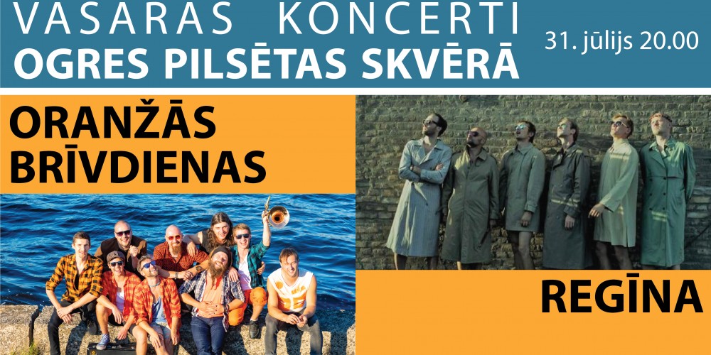 Mainoties pasākuma norises programmai, grupas RIGA REGGAE vietā koncertcikla noslēguma pasākumā uz skatuves kāps grupa REGĪNA, kuras sastāvā ir aktieri Varis Piņķis, Gatis Gāga, Māris Bezmers, Kaspars Zvīgulis, Ivars Krasts, Gundars Grasbergs un Jēkabs Nīmanis. Grupai raksturīga atturīga instrumentu pārvaldīšana, ko tās dalībnieki kompensē ar ekscentrisku skatuves uzvedību. Mūziķi, sev ierastā manierē, atskaņo ļoti dažādu mūziku, skaņdarbus izpildot latviešu, krievu, angļu, vācu, ukraiņu, dienvidslāvu, indiešu un citu valodu interpretācijās. Pasākuma turpinājumā koncerta apmeklētājus ar savu sniegumu priecēs atraktīvie grupas ORANŽĀS BRĪVDIENAS mūziķi. Grupa pati savu mūzikas žanru dēvē par TurboFolk - mūziku, kurā dažādu stilu elementi sajaukušies kokteilī, kas pilns ar pozitīvu enerģiju. Mūziķu apvienība ORANŽĀS BRĪVDIENAS uzstājusies gandrīz visos mūzikas klubos un festivālos Lavijā, kā arī vairākkārt devusies koncerttūrēs pa Eiropu. Grupu REGĪNA un ORANŽĀS BRĪVDIENAS uzstāšanās būs trešais jeb noslēdzošais pasākums Ogres novada Kultūras centra organizētājā koncertciklā VASARAS KONCERTI PILSĒTAS SKVĒRĀ, kas Ogres iedzīvotājiem un pilsētas viesiem ļauj baudīt brīvdabas koncertus bez maksas.