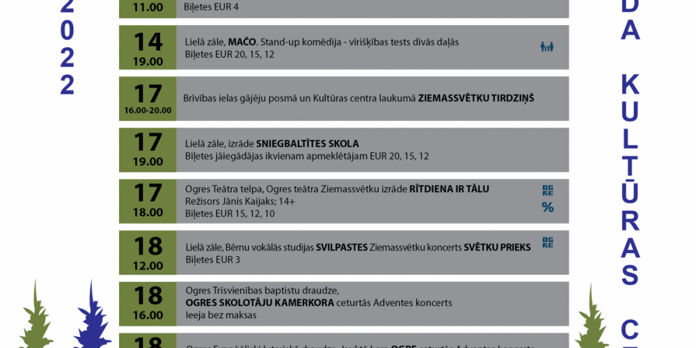 Decembrī Ogres novada Kultūras centrs aicina uz koncertiem, teātra izrādēm, kino un citiem aizraujošiem notikumiem.