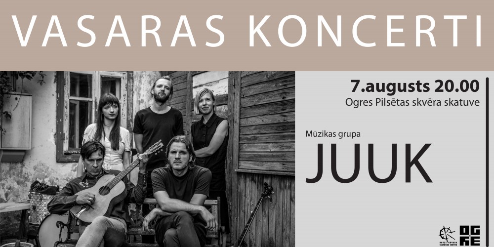 Grupā JUUK apvienojušies 5 zināmi pašmāju mūziķi, kurus vieno aizraušanās ar alternatīvo, tumšo folk un kantrī mūziku. JUUK sastāvā muzicē: Sniedze Prauliņa (balss, flauta), Edgars Šubrovskis (balss, ģitāras, bass), Oskars Jansons (balss, ģitāras, bandžo), Dina Skreitule (vijole, piebalss) un Rinalds Maksimovs (bungas). Grupas koncertos valda īpaša atmosfēra, kas veidojas vietas, mūziķu un klausītāju mijiedarbībā. “Noskaņa un skanējums atšķiras katrā koncertā. Mums ir daudz akustisku instrumentu un mēs pielāgojamies katrai vietai kurā spēlējam,” intervijā medijiem atzīmējuši grupas dalībnieki. Koncertā uz Ogres Pilsētas skvēra skatuves tiks atskaņotas dziesmas no 2019. gada vasarā izdotā debijas albuma INDULGENČU TIRGOTĀJI, kas nominēts AUSTARAS BALVAI un ZELTA MIKROFONAM kategorijā LABĀKAIS ALTERNATĪVĀS VAI INDIE MŪZIKAS ALBUMS, kā arī citi mūziķu radīti skaņdarbi. Koncerta laikā lūdzam ievērot visus fiziskās distancēšanās un epidemioloģiskās drošības noteikumus. Pasākumu organizē Ogres novada Kultūras centrs. Brīvdabas koncerta apmeklējums bez maksas. Informāciju sagatavoja: Anete Andersone, Sabiedrisko attiecību speciāliste, Ogres novada Kultūras centrs
