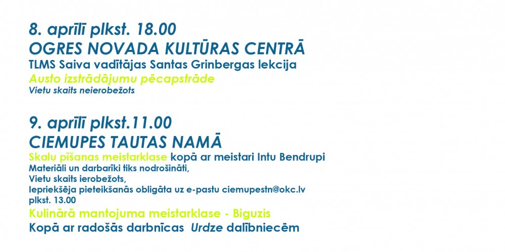 8., 9. un 10. aprīlī Ogres novada Kultūras centrs aicina uz Latvijas Nacionālā kultūras centra (LNKC) projekta SATIEC SAVU MEISTARU pasākumiem Ogrē, Ogresgalā un Ciemupē.