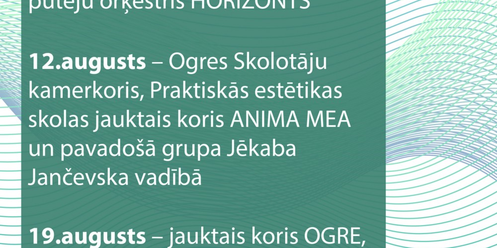 12.augustā pulksten 20.00 Ogres upi pieskandinās Ogres novada Kultūras centra Ogres Skolotāju kamerkoris, Rīgas Praktiskās estētikas skolas jauktais koris ANIMA MEA un pavadošā grupa Jēkaba Jančevska vadībā.