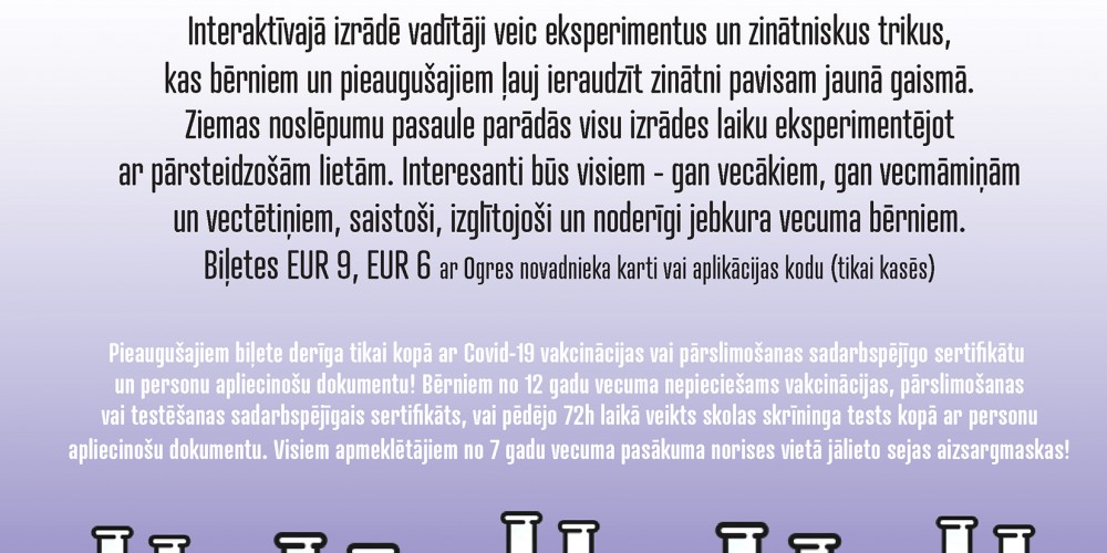 Interaktīvās izrādes vadītāji veiks eksperimentus un zinātniskus trikus, kas bērniem un pieaugušajiem ļaus ieraudzīt zinātni pavisam jaunā gaismā. Izrādes laikā, eksperimentējot ar pārsteidzošām lietām, klātesošajiem atklāsies ZIEMAS NOSLĒPUMU pasaule.
